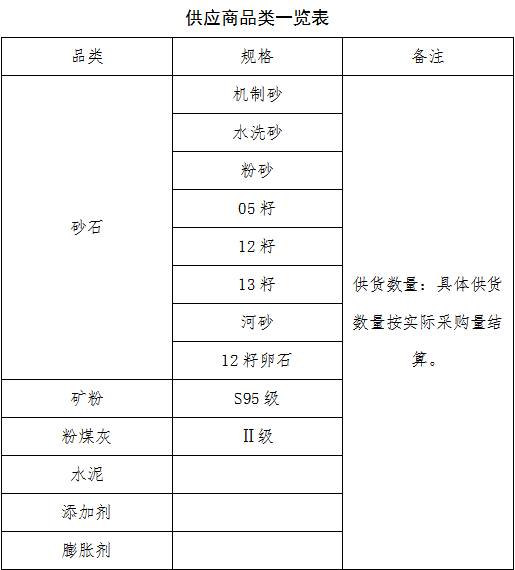 本次征集活動(dòng)為2025年度第二次原材料供應(yīng)商的征集,征集供應(yīng)商品類為:砂石、水泥、粉煤灰、礦粉、膨脹劑、減水劑、外加劑等,現(xiàn)每年總需求約200萬噸。