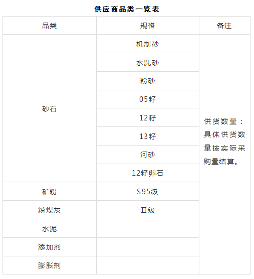 本次征集活動為2025年度第一次原材料供應商的征集,征集供應商品類為:砂石、水泥、粉煤灰、礦粉、膨脹劑、減水劑、外加劑等,現(xiàn)每年總需求約200萬噸。