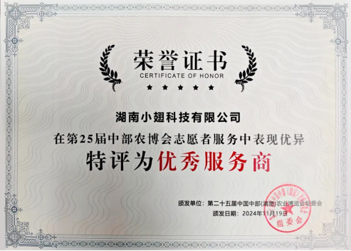 2024年5月,“小翅俠”志愿者服務(wù)團(tuán)隊(duì)首次在2024年“機(jī)甲大師超級(jí)對(duì)抗賽上”亮相,獲得了主辦方、指導(dǎo)單位及政府對(duì)“小翅俠”志愿者服務(wù)團(tuán)隊(duì)優(yōu)質(zhì)服務(wù)的高度認(rèn)可與贊譽(yù)。2024年11月,“小翅俠”志愿者服務(wù)團(tuán)隊(duì)亮相“第25屆中國中部(湖南)農(nóng)業(yè)博覽會(huì)”,再次以優(yōu)質(zhì)服務(wù)獲得了各方的高度認(rèn)可與贊譽(yù),并被組委會(huì)評(píng)選為“優(yōu)秀服務(wù)商”的榮譽(yù)稱號(hào)。這不僅是對(duì)“小翅俠”志愿者團(tuán)隊(duì)的肯定,更是對(duì)志愿者們青春擔(dān)當(dāng)?shù)恼J(rèn)可。