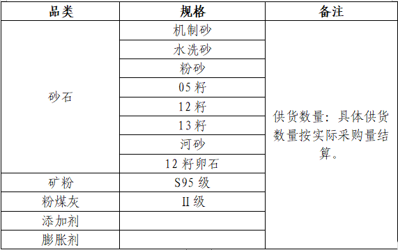 本次征集活動為2024年度第一次原材料供應(yīng)商的征集,征集供應(yīng)商品類為:砂石、水泥、粉煤灰、礦粉、膨脹劑、減水劑、外加劑等,現(xiàn)每年總需求約200萬噸。
